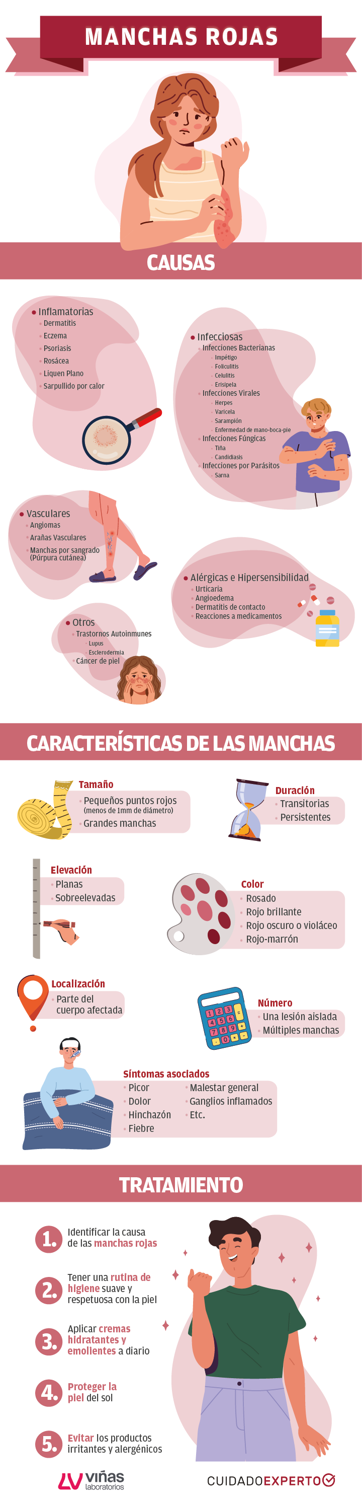 En esta infografía se muestran las posibles causas de las manchas rojas en la piel, los diferentes tipos y cuál debe ser su tratamiento.